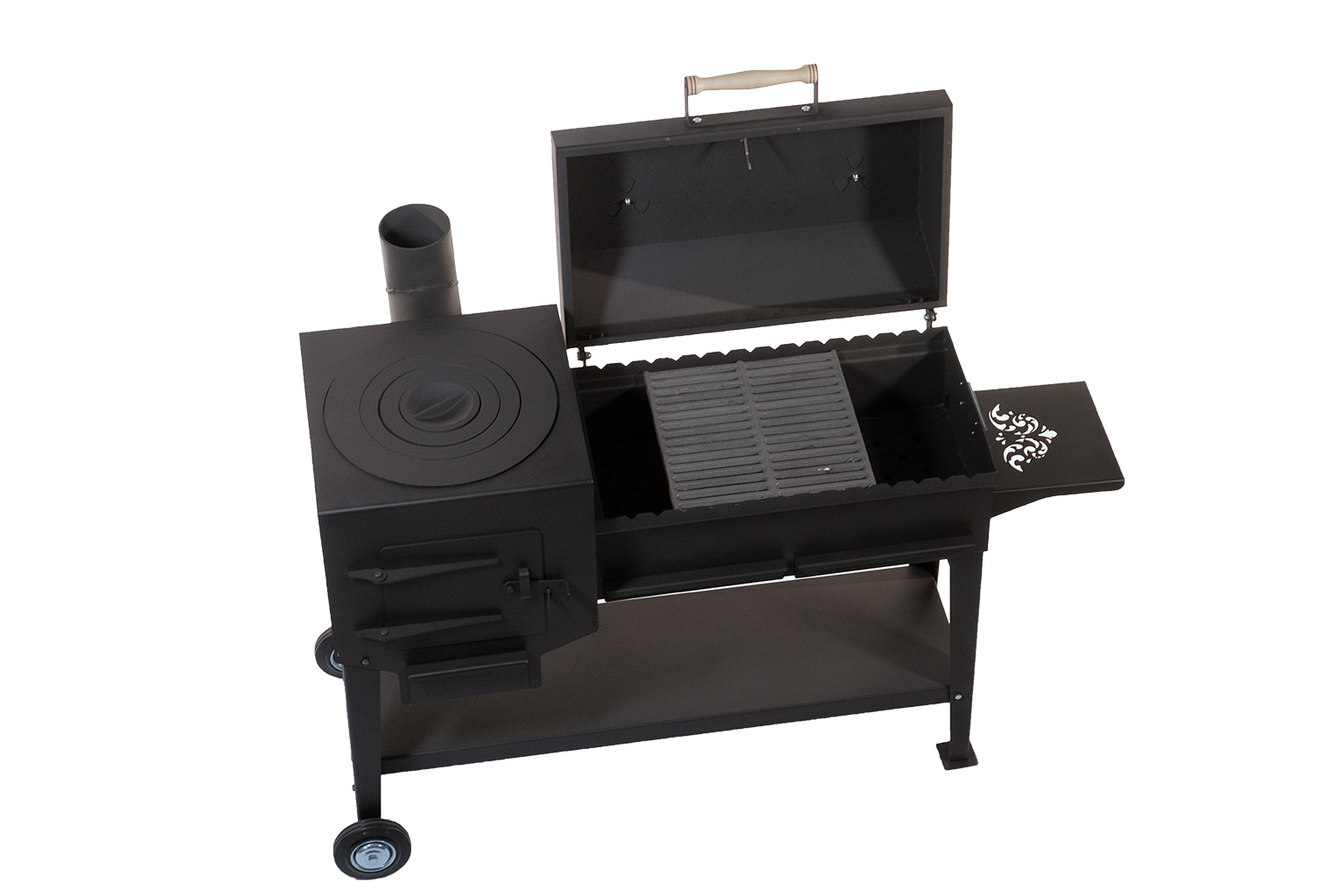 Зольный ящик разделен на 2 сегмента, что позволяет легко удалить продукты горения после использования данной модели, сохраняя чистоту на дачном участке, а также регулировать интенсивность горения как с одной, так и с другой половины. Удобные полки позволяют с комфортом разместить все необходимые аксессуары.