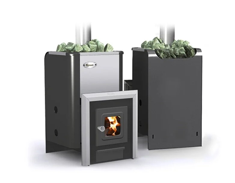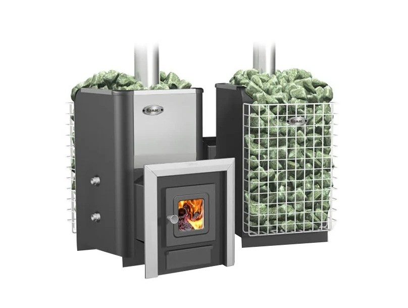 Выносной топливный канал позволяет монтировать печь через стену: из моечной или комнаты отдыха. Топочная дверка оснащена небольшим квадратным стеклом через