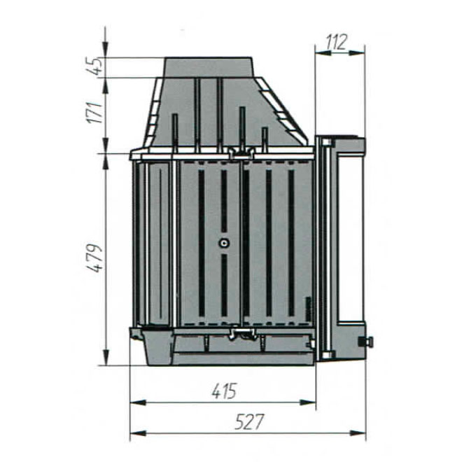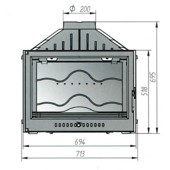 Патрубок дымохода диаметром 150 миллиметров выходит на скошенную часть задней стенки топки. Он расположен под углом 45 градусов, что позволяет подключать к топке как вертикальный, так и горизонтальный дымоход.