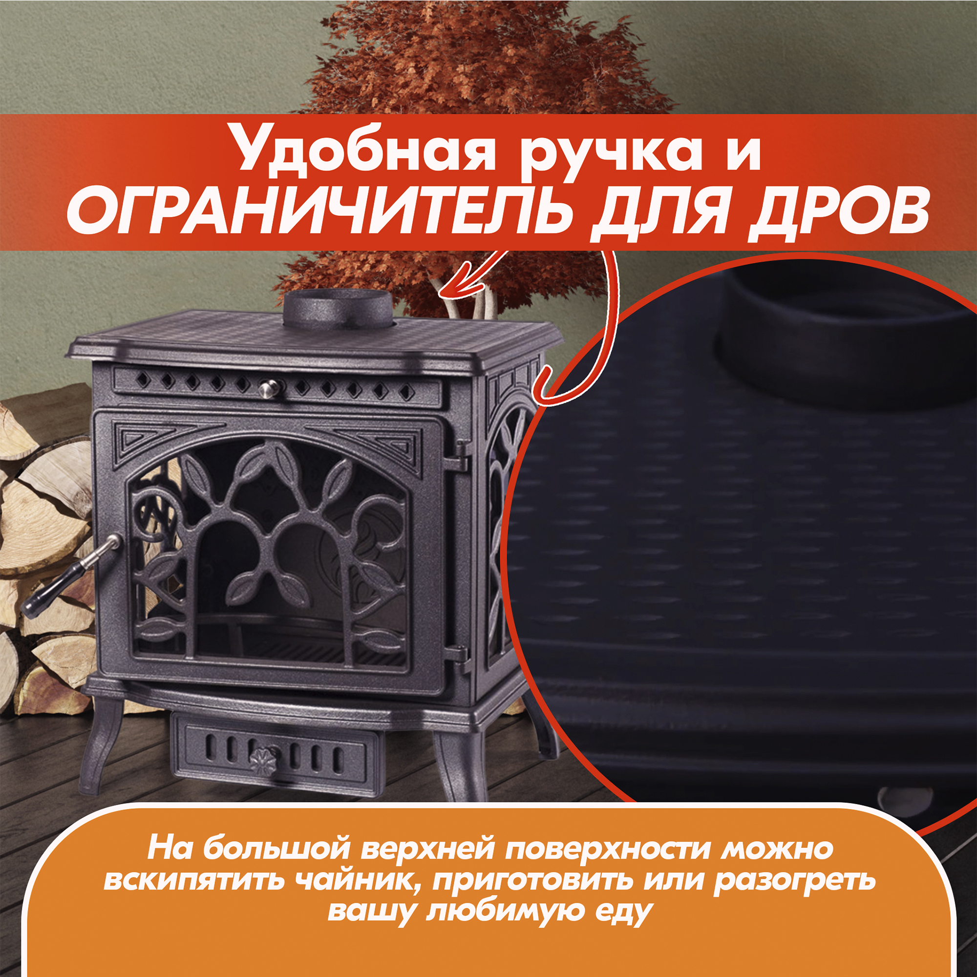 Боковые стенки и дверца печи-камина оформлены большими окнами из огнеупорного стекла, дополненными цветочным узором из чугуна.