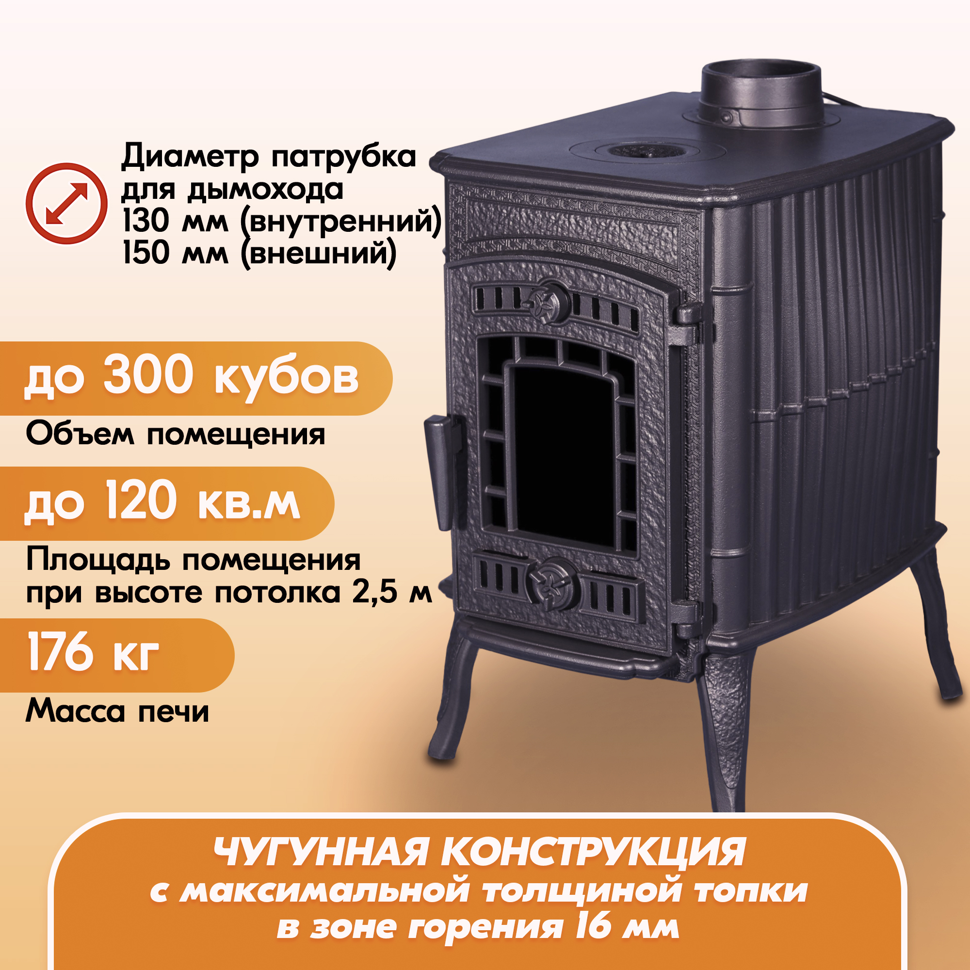 Благодаря большой массе (176 кг) чугунный камин эффективно накапливает тепло и долго остывает, прогревая помещение.