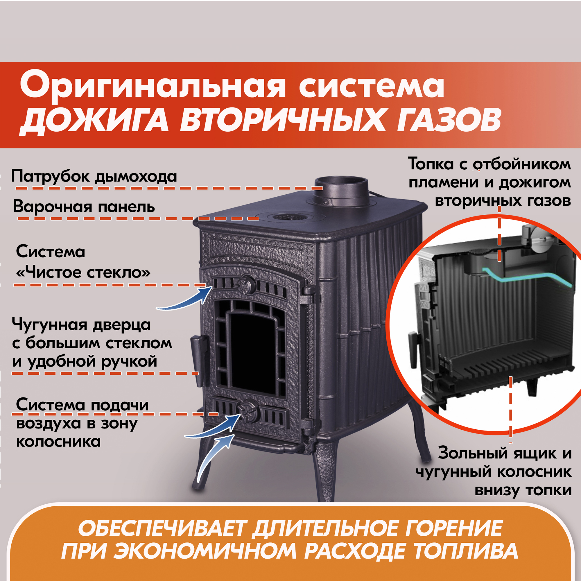 Проверенная конструкция демонстрирует отличные показатели в категориях длительность горения, объем отапливаемого помещения, скорость нагрева, экономичность расхода топлива.