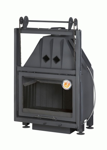 У этой модели дверь для закладки дров открывается вверх. Подъем двери легкий. Практически без усилий. Достигается это за счет противовеса, разгружающего вес двери.