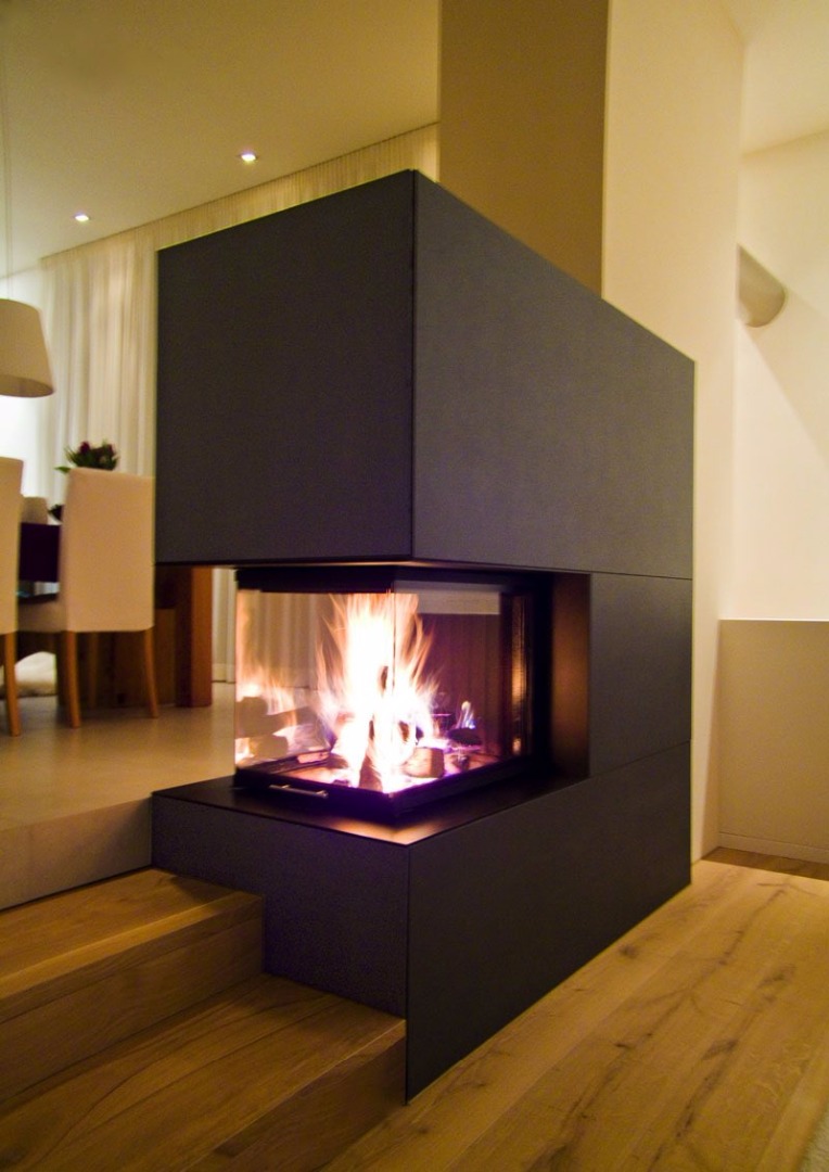Дверь каминной топки декорирована плоским стеклом. Такие стекла делаются всего в 2 странах: Германии и Японии. Оно выдерживает температуру до 750 градусов. Но если ударить кочергой, то может треснуть. Через стекло любуются огнем и следят за прогоранием дров и подкладкой новых.
