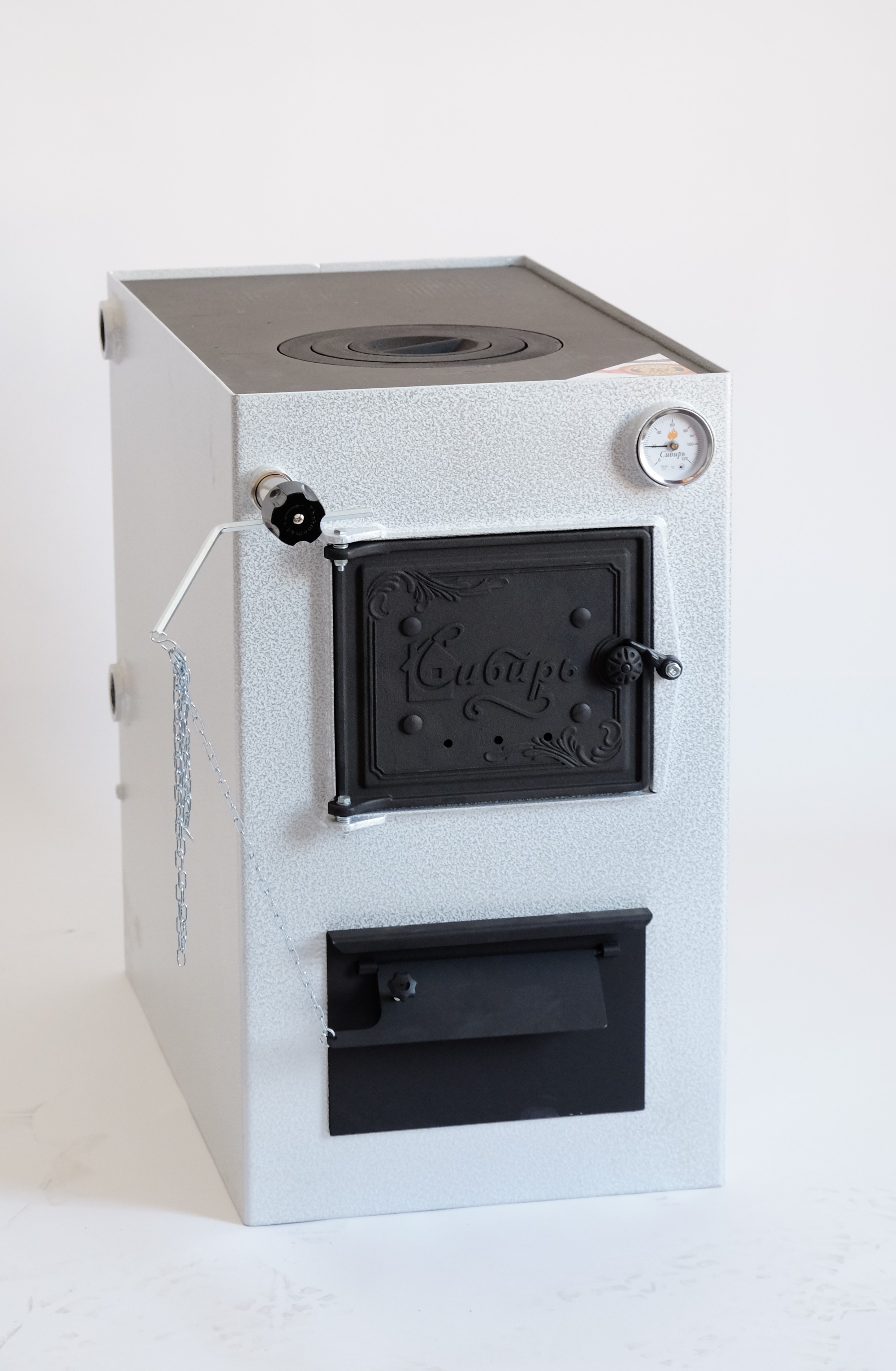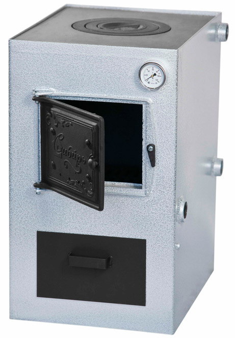 Твердотопливный котел "Сибирь КВО" 10 кВт - это пионер в линейке котлов с варочной поверхностью, в котором предусмотрена возможность установки автоматического регулятора тяги подачи воздуха.