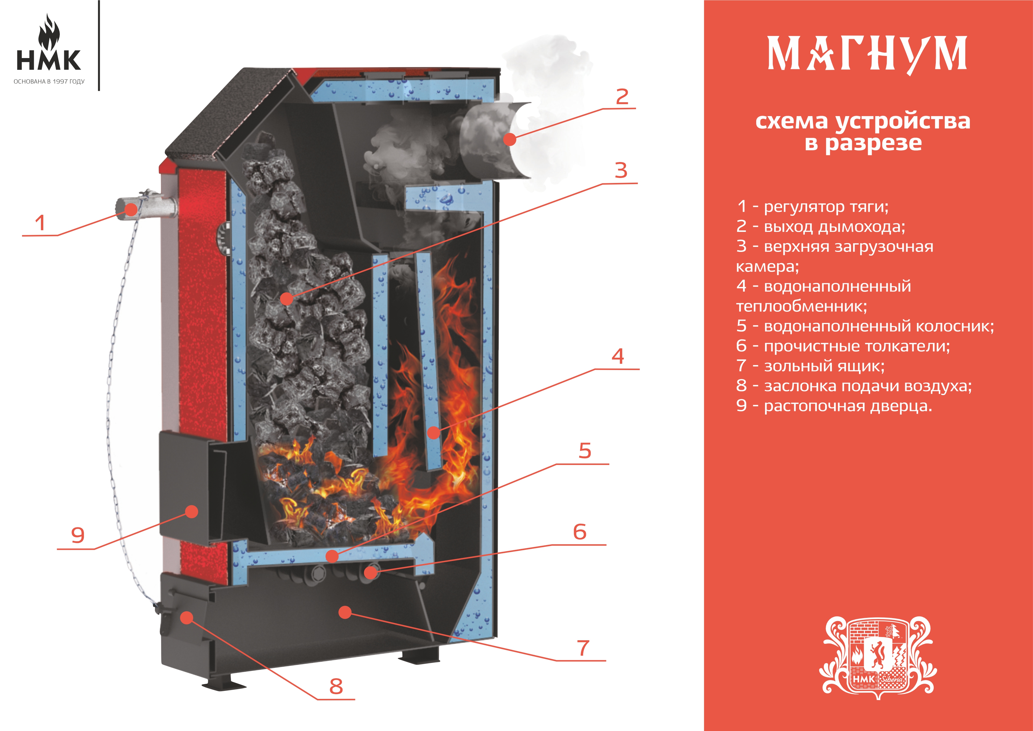 Главное отличие котла «Магнум» от зарубежных и российских аналогов заключается в его конструктивных особенностях и возможности его использования в качестве котла длительного горения. Время бесперебойной работы в режиме горения составляет один отопительный сезон с момента первого розжига. Иными словами, в течение всего отопительного сезона данный котел не нужно тушить, а процесс выемки золы и остатков продуктов горения твердого топлива можно производить без остановки работы котла. Здесь применима схема: "Растопил "Магнум" по осени - затушил его по весне".
